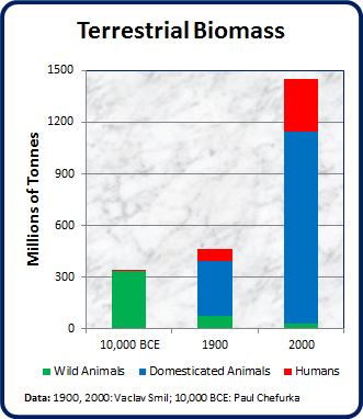 This is why scientists are calling this era the "Anthropocene Age" where human activity is directly impacting the environment. This is an age defined by nuclear activity, pollution by plastics, and the spread of domestic chicken. In fact, of all mammals on Earth today, 60% are domestic animals, 36% are humans, and only 4% wild animals!
