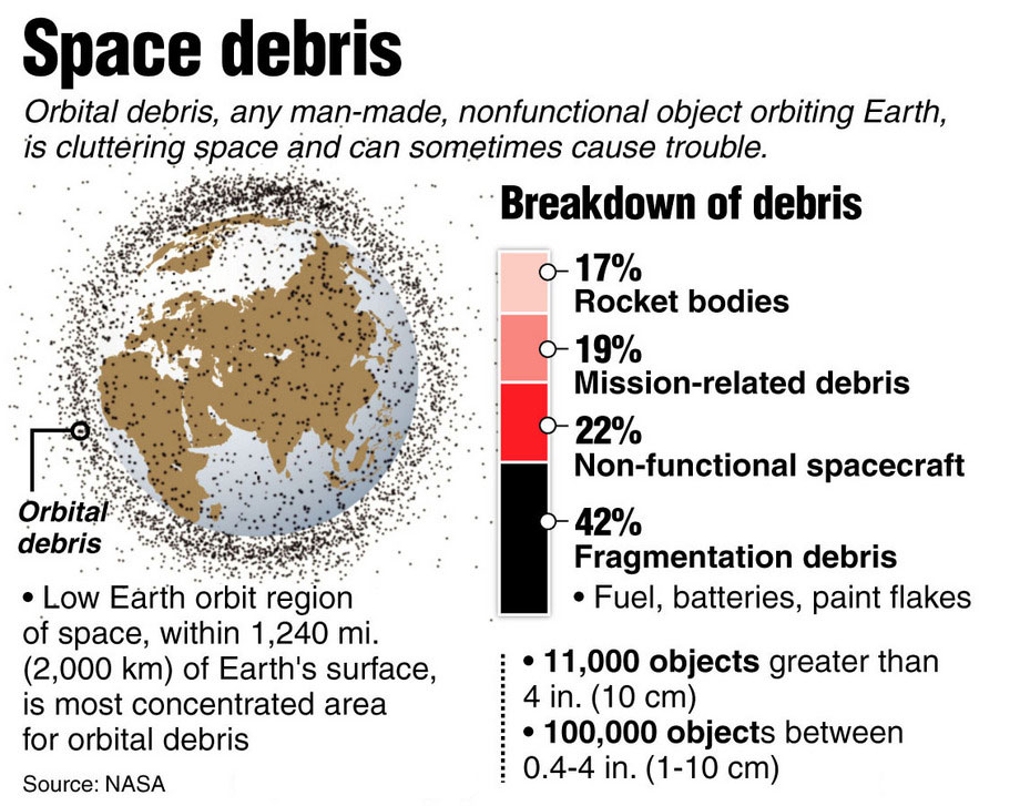 Space junk is man-made material without use that floats out in space…materials like defunct satellites, rockets, and flecks of paint.